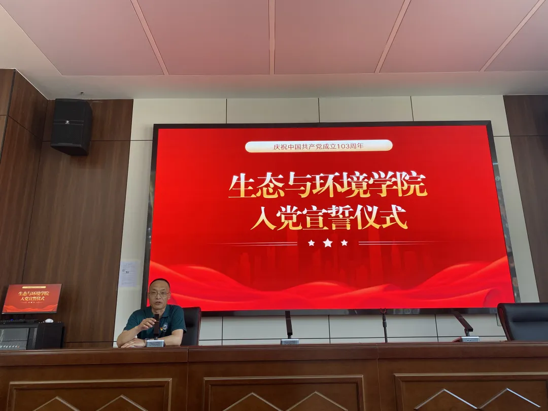 2024 年 7 月 1 日下午,值中国共产党成立 103 周年之际,ok138cn太阳集团529在学院楼102隆重举行入党宣誓仪式。生态与环境学党委负责人、常务副院长王立新,党委副书记郭瞳,新发展的预备党员同志以及支部党员代表出席了本次仪式,宣誓仪式由钱超时主持。