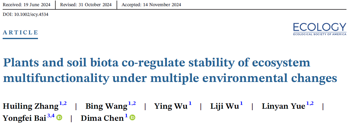 该研究成果以"Plants and soil biota co-regulate stability of ecosystem multifunctionality under multiple environmental changes"为题,发表在创刊于1920年的生态学领域顶级期刊Ecology上。团队客座青年教师张慧玲和王冰为共同第一作者,陈迪马教授为通讯作者,OK138太阳集团为该论文的第一和通讯单位。该研究得到了国家自然科学基金和OK138太阳集团骏马计划项目的资助。