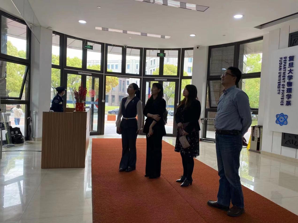 复旦大学物理学系党委书记刘召伟引领参观,讲解了物理学系的历史沿革及文化建设。