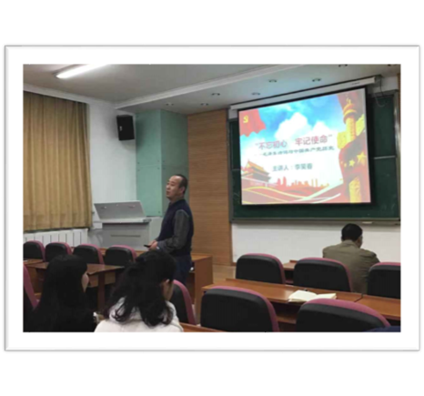 2019年10月16日下午4:30ok138cn太阳集团529在生物楼101开展了以“不忘初心,牢记使命——毛泽东诗词与中国共产党历史”为主题的全区高校“百场形势政策报告会”系列之三,ok138cn太阳集团529全体教师参会。报告会主讲人为我院党总支书记李笑春。