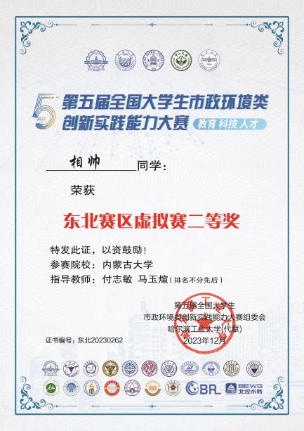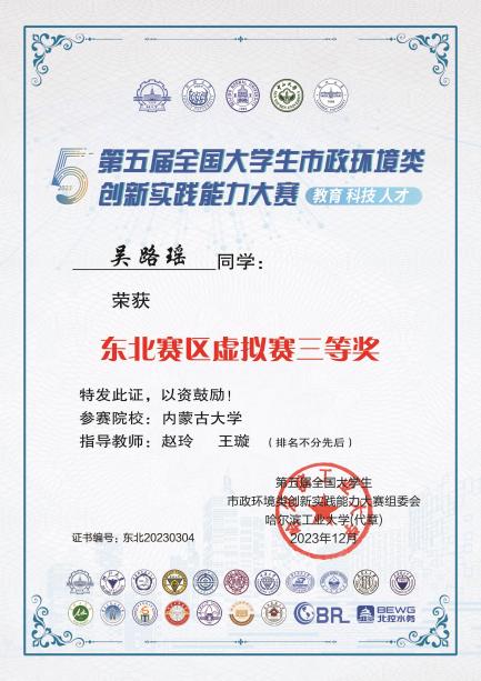 2023年12月6日,第五届全国大学生市政环境类创新实践能力大赛东北地区选拔赛结果公示,ok138cn太阳集团529由王立新常务副院长担任领队,组织5支队伍15名同学首次参加此类赛事,参赛队伍取得优异成绩,环境工程专业2021级王宇、相帅同学分别获得东北赛区虚拟赛二等奖,环境工程专业2020级吴路瑶同学获得东北赛区虚拟赛三等奖;付志敏、赵玲、王璇、马玉煊老师荣获优秀指导老师奖;由付志敏和马玉煊老师指导的不会取名队(由环境工程2021级王宇、相帅、伍珈萱同学组成)晋级全国决赛。