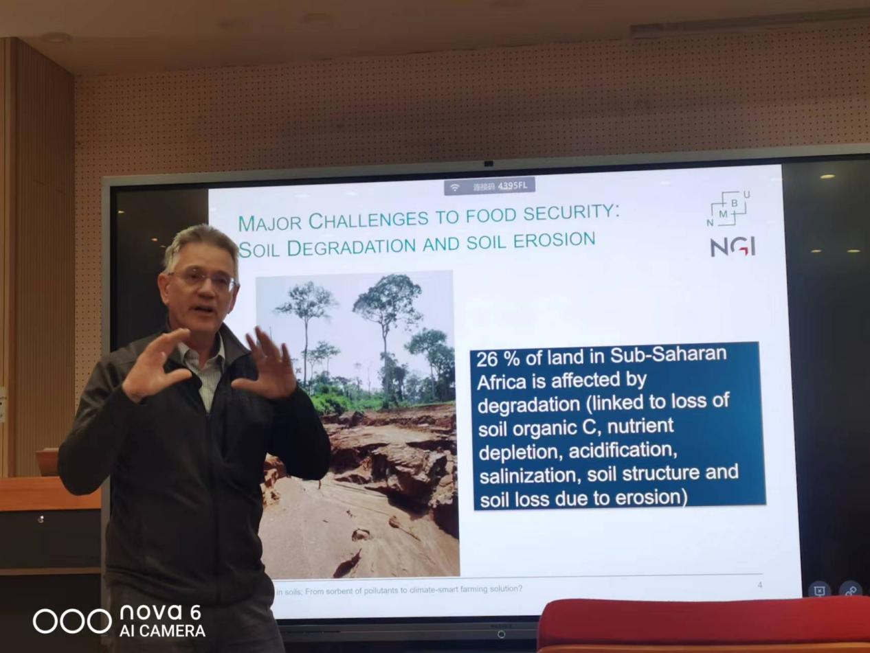 Jan Mulder教授为清华大学客座教授,多年来一直从事陆地生态系统碳、氮和微量元素的生物地球化学循环过程的研究,目前主要关注全球变化背景下温室气体排放、多种元素的生物地球化学循环和生物碳对改善农业土壤质量的影响等,发表论文170余篇,H-index 57。学术报告中,Jan Mulder教授介绍了生物炭(Biochar)在改善土壤结构、增加土壤肥力、提高农作物产量等方面的功效,深入讲解了其在非洲和南亚多国农业领域的应用。